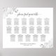 This seating chart contains table assignments for 170 guests at 17 tables, 10 guests per table. The design is simple yet elegant with dark gray text on a white background and silver faux foil lacy frills in the corners. Beautiful way to help your guests find the right table at your wedding reception. The title reads "please find your table" in elegant script calligraphy.