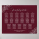 This seating chart contains table assignments for 170 guests at 17 tables, 10 guests per table. The design is simple yet elegant with gray text on a burgundy or maroon background and silver faux foil lacy frills in the corners. Beautiful way to help your guests find the right table at your wedding reception. The title reads "please find your table" in elegant script calligraphy.