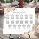 This 17 table wedding seating chart features a traditional layout with room for 170 guests (10 seats per table) printed on a foam core board which is sturdy enough to stand up on its own without the use of a frame. The rustic hand painted design features hand painted watercolor roses and blossoms in shades of blush pink, coral peach, and mauve, with an elegant script calligraphy title. The names of the couple and wedding date are displayed at the bottom. Wonderful way to add rustic beauty and style to your wedding reception while making it easy for your guests to find their assigned tables.