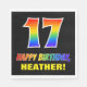 This cheerful, colorful, and fun birthday paper napkin design features a large number "17" and the message "HAPPY BIRTHDAY,", both having a rainbow spectrum gradient inspired pattern coloring, along with a bold yellow personalized recipient name. The background is colored black. Fun, personalized birthday themed paper napkins like this might be used at somebody’s 17th birthday celebration. [~Z0000476]
