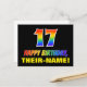 The front of this fun, colorful, and cheerful birthday themed postcard design features a large number "17" and the message "HAPPY BIRTHDAY,", both having a rainbow spectrum gradient inspired pattern coloring, along with a bold yellow editable recipient name. The front also has a simple black colored background. The back of the postcard features a customized birthday greeting message, or could perhaps be cleared and left blank if a message is to be written by hand instead. An exciting customizable birthday postcard like this might be a fun way to send a message celebrating somebody’s seventeenth birthday. [~Z0000474]