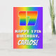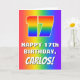 The front of this fun and cheerful birthday greeting card design features a large number “17” with a rainbow spectrum inspired gradient pattern, along with the message “HAPPY 17th BIRTHDAY,”, and a personalized name. The background on the front also has an exciting multicolored rainbow spectrum gradient pattern. The inside has a customizable birthday greeting message, or could perhaps be cleared and left blank if a message is to be written by hand instead. A happy, customized birthday greeting card like this might be a fun way to deliver some birthday wishes to somebody who is celebrating their seventeenth birthday. [~Z0000570]