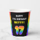 This fun and upbeat birthday-themed paper cup design features a big number “17“ with a multicolor rainbow spectrum inspired gradient pattern, along with the message “HAPPY 17th BIRTHDAY,”, and a custom recipient name. Birthday themed paper cups like this might be a fun way to celebrate somebody’s 17th birthday. [~Z0000639]