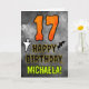 The front of this spooky and scary Halloween themed birthday greeting card design features a large number “17”, along with the message “HAPPY BIRTHDAY,”, and a customizable name. There are also depictions of a bat and a ghost on the front. The inside features a custom birthday greeting message, or could perhaps be cleared and left blank if a message is to be written by hand instead. A personalized birthday card like this might be a fun way to send a message in celebration of somebody’s seventeenth birthday that also falls on Halloween (October 31st). [~Z0000547]