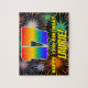 This upbeat and bold birthday themed jigsaw puzzle design features a large number “17” having a multicolored rainbow spectrum inspired gradient pattern. It also features the message “HAPPY 17th BIRTHDAY,”, and a customizable recipient name. The background features a colorful, multicolored, bursting celebratory fireworks-inspired pattern. A cheerful, customizable birthday puzzle like this might be a fun way to deliver some birthday wishes to somebody who is celebrating their seventeenth birthday. [~Z0000605]