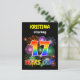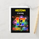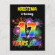 The front of this fun and vibrant birthday party invitation postcard design features an editable name, an exciting bursting celebratory fireworks inspired pattern, and the message "17 YEARS OLD!" having a colorful rainbow spectrum inspired gradient pattern. The back features an editable message that could describe when and where the party is being held, in addition to other relevant information. Invitation postcards like this could be sent to potential attendees of a party being held to celebrate the birthday of somebody who is turning 17 years old. [~Z0000452]