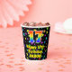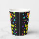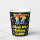 This fun and joyful birthday paper cup design features a large number “17” with a rainbow spectrum gradient inspired pattern, along with the message “Happy 17th Birthday,”, and a customizable name. The background features a vibrant and colorful star field inspired pattern. Vibrant, colorful paper cups like this might be fun to use at a birthday party/celebration being held to celebrate somebody’s 17th birthday. [~Z0000540]