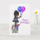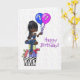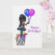 A cute card for a 17 year old girl. Card features big-eyed, dark-skinned girl sitting on packages holding balloons. Confetti background.