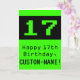 The front of this fun and nerdy birthday-themed greeting card design features a large green vintage video gaming style number "17". It also features the birthday greeting message "Happy 17th Birthday,", and a customizable name. The inside features a customized birthday greeting message, or could perhaps be cleared and left blank if a message is to be written by hand instead. A geeky customizable birthday card like this might be a fun way to acknowledge somebody’s seventeenth birthday. [~Z0000430]