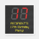 This silly and geeky birthday-themed paper napkin design features a large number "17" having a red seven segment digital display inspired look, along with a custom name and the message "17th Birthday Party!" in nerdy retro style yellow text, on a black colored background. Birthday themed paper napkins like this might be used when celebrating somebody’s 17th birthday. [~Z0000388]
