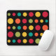 A design made up of five rows of seven circular spots ordered by size and arranged in alternating directions in an attractive pallet of colors.
