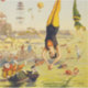 This vibrant reproduction of a 1898 poster celebrates a Coney Island water circus sideshow. The poster features bright colors—yellows, reds, blues, and greens—with a bold red circus headline. Unlike traditional Victorian circuses, this Water Carnival was a unique event offering beach activities alongside spectacular water performances. The illustration showcases circus performers diving into the water, clowns on a barrel, swimmers, and individuals using water walker devices. The detailed artwork captures the playful and adventurous spirit of the era, offering a glimpse into a fun-filled Victorian excursion at Coney Island.