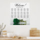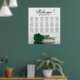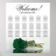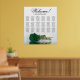 Enhance the elegance, romanticism, and flair of your wedding celebration with this 18 table seating chart, which accommodates up to 180 guests, with each table having 10 seats. The design showcases a stunning, contemporary floral motif that includes a solitary, long-stemmed rose in a rich, emerald green hue, placed horizontally and reflecting in a pool of water. The heading is written in elegant script calligraphy and reads "Welcome! Please find your seat," with the names of the newlyweds and the wedding date at the bottom. This seating chart offers a superb opportunity to warmly welcome your invitees and assist them in locating their respective seats with ease.