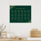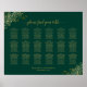 This seating chart will help your guests find their assigned tables at your wedding reception. It features a simple yet elegant design with gold text on an emerald green background. The title is written in beautiful script calligraphy lettering and reads: please find your table. The design features a lacy floral faux foil gold filigree in the corners. Contains seating assignments for 18 tables at 10 guests per table or 180 guests.