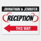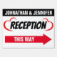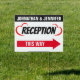 Getting ready for a wedding? Let everyone know where you are going to celebrate after the wedding with this double sided 18" x 24" "Reception" yard sign! This sign is fully customizable, add your personalized details as well as change the color of the background, hearts, and arrow to fit your personal needs. Yard signs are lightweight, weather and wind resistant for outdoor use. Choose the wire stake stand for easy installation outdoors. Pricing discounts begin when you buy 6 or more of the same sign design.