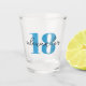 Personalized 18th birthday shot glass with blue age text and modern script name. Colors and fonts can be changed if required.