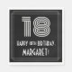 This vintage style birthday-themed paper napkin design features a large Art Deco style inspired number "18", the message "HAPPY 18th BIRTHDAY,", a customizable name, and a border pattern consisting of lines. Fun, customized paper napkins like this might be used at a birthday celebration being held in honor of somebody’s eighteenth birthday. [~Z0000395]