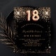 A modern, stylish and glamorous invitation for a girl's 18th birthday party. A black background decorated with faux glitter. The name is written with a modern golden colored hand lettered style script. Personalize and add your party details. Number 18 is written with a balloon style font, script.