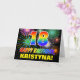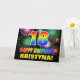 The front of this colorful, fun, and cheerful birthday themed greeting card design features a large number "18" and the message "HAPPY BIRTHDAY,", both colored with a rainbow spectrum gradient inspired pattern, along with a bold yellow personalized recipient name. The front also has a multicolored background pattern inspired by the look of bursting celebratory fireworks. The inside features a customizable birthday greeting message, or could perhaps be cleared and left blank if a message is to be written by hand instead. A cheerful personalized birthday card like this might be a fun way to send a message celebrating somebody’s eighteenth birthday. [~Z0000471]