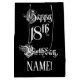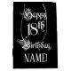 This ornate and lavish birthday-themed giftbag design features the message “Happy 18th Birthday,” in luxurious script style text, on a black colored background. It also features a custom recipient name. A formal giftbag like this might be used when giving a gift or present in honor of somebody’s 18th birthday. [~Z0000557]