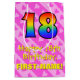 This cheerful, upbeat, and fun birthday themed giftbag design features a large number "18" with a rainbow spectrum gradient inspired pattern, along with the message "Happy 18th Birthday,", and a custom recipient name. It also has a loving background featuring pink-colored heart shapes within a stripes pattern. A happy gift-bag like this might be used when wrapping presents being given to somebody in celebration of their eighteenth birthday. [~Z0000511]