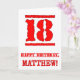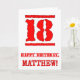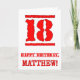 This fun birthday themed greeting card design features a large red number “18” having a rubber stamp inspired look, plus the birthday greeting message “HAPPY BIRTHDAY,” and a custom name on the front. The inside has a personalized birthday greeting message, or could perhaps be cleared and left blank if a message is to be written by hand instead. A fun customized birthday greeting card like this might be used to celebrate somebody’s eighteenth birthday. [~Z0000524]