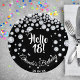 An elegant and glamorous black and white paper plate for a 18th birthday party for a girl. A chic black colored background. A black colored circle with modern hand lettered style text: Hello 18! Faux diamonds as decoration. Template for a name and a date, curved text.