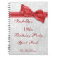 Elegant Eighteenth Birthday Party guest book women. 18th Birthday Party! Beautiful white damask pattern background with a pretty, stylish romantic red bow and ribbon image. These glamorous, classy guest books are perfect for women and are decorated / printed on the front side only. Women will love this chic modern birthday party guest book. All text is fully customizable to meet your requirements. PLEASE NOTE: All products on Zazzle have flat printed images. Bow and ribbon images purchased from digital-designs-by-elena. If you need any assistance customizing your product please contact me through my store and I will be happy to help.