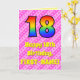 The front of this happy and fun 18th birthday themed greeting card design features a large number "18" having a colorful pattern inspired by the appearance of a rainbow spectrum. It also features the message "Happy 18th Birthday,", followed by a custom recipient name. The background of the front features a light pink and dark pink stripes pattern containing loving pink heart shapes. The inside features a customizable birthday greeting message, or could perhaps be cleared and left blank if a message is to be written by hand instead. A personalized birthday card like this might be a fun way to acknowledge somebody’s eighteenth birthday. [~Z0000416]