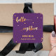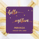 Elegant and modern for a 18th birthday party. Purple backdrop and faux gold text written with a trendy hand-lettered style script: hello eighteen. With golden dots as decor. Templates for a name and date. Perfect on party favors or as a save the date reminder for your guests.