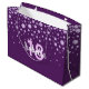 An elegant and glamorous 18th birthday gift bag. Girly purple backdrop and faux diamonds. Templates for a name and age 18. White and pink colored letters. The name is written with a hand-lettered style script.