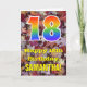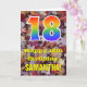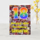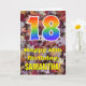 The front of this colorful, rustic, and autumn-themed birthday greeting card design features a large number "18" with a rainbow spectrum gradient inspired pattern, along with the message "Happy 18th Birthday,", and a custom name. The background of the front of the card features a rustic fallen autumn leaves pattern. The inside features an editable birthday greeting message, or could perhaps be cleared and left blank if a message is to be written by hand instead. A birthday card like this might be a fun way to send birthday wishes to somebody who is celebrating their eighteenth birthday. [~Z0000384]