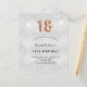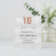 A modern, stylish and glamorous invitation for a 18th birthday party. A faux silver looking background, decorated with glitter dust. Personalize and add your name nad party details. Number 18 is written with a rose gold balloon style font, script.
