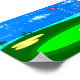 Poster depicting a digital illustration of the 18th hole on a golf course with a cloudy blue sky, lake, trees, sand trap and the golf ball sitting on the green, inches away from the cup waiting to be putted in.