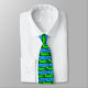 Necktie depicting a digital illustration of the 18th hole on a golf course with a cloudy blue sky, lake, trees, sand trap and the golf ball sitting on the green, inches away from the cup waiting to be putted in.