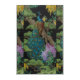 A lovely fine art print of "The Cedar Tree" created by Arthur Sanderson & Sons Ltd., a British manufacturer of fabrics and wallpaper founded in 1860. This particular design dates back to 1910 and was block-printed on machine-made paper. The design boasts a solid black background, against which sits a diagonal branch of cypress from which grows clusters of cypress evergreen sprinkled with large bunches of lilac blossoms and foliage, and hanging clusters of yellow wisteria. On the branch sits a large peacock with a rich, brown body, blue neck and head, and a full luxurious blue tail falling among the blossoms and foliage.