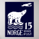 The 1925 Norwegian 15 Ore Air Mail postage stamp. The stamp features a Polar Bear on an ice sheet watching an airplane delivering mail. This design is available in dark blue, white and a light blue.