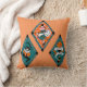 These vintage Halloween characters are from 1929 and depict an abstract, Beaux Arts style illustration of the 1930s era for children. The Halloween set includes a vintage dancing pumpkin head lady, a Witch with a polka dot bag on a broom, and a dancing cat man. The primary colors of blue-green and orange are unique for Halloween. The original designs were set in a zigzag, diamond pattern frame.