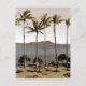 1940 hand colored photograph depicting the famous Diamond Head of Hawaii through a grove of palm trees. In the background homes, a hotel, a few sailing vessels and whitecaps from breaking waves are seen.