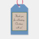 Set of 10 blue rectangular gift tags with a vintage 1940s image of colorful ornaments tied with ribbon on a green Christmas tree bough on peach with a green border. The sentiment reads, “Christmas Greetings.” The back is blue with a peach rectangle with a green border and customizable text. See the entire Holiday Gift Bag & Gift Tag collection in the PARTY FAVORS section.