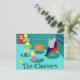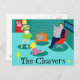 This customizable 1950's Classic Television Postcard features a perfect 1950's family in its natural habitat. They are in their turquoise and teal living room. The father is lounging in his red egg chair, while reading the newspaper. The daughter is sprawled out on the floor in a lovely, pink frock. Her blonde hair is in a ponytail and she is kicked back watching a black and white television show on the bright orange, tube TV set. To the left, the mother is wafting into the room in a flouncy green dress and a white apron with red detailing. Not a hair on her blonde head is out of place. She is carrying a pink, three-layer cake with chocolate frosting. You won't believe the details in this design. The bright, red door in the distance, the retro artwork on the wall, the real newsprint on Dad's newspaper and the black and white housewife vacuuming her 1950's living room on the television set make this absolutely irresistible! Simply click on the "Customize It" icon to replace the existing text with your own. Oh, my stars! They are a 1950's classic television family watching a 1950's classic television show. Is there no end to this brilliance?
