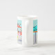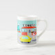 Serve up something special with this 1950's Diner Bone China Mug. The cartoon drawing design features a red brick building with blue windows, gray double doors, and a white sign that says, "Diner" perched on the roof. In the parking lot, a second sign is on a pole. The sign has a turquoise background and a flashing red arrow pointing the way to, "Don's Diner." The sign has done its job because there is a bright yellow car with fins parked next to it. Even though we can't see them, the passengers of the car must be smacking their lips. A cute, young carhop is rollerskating her way to the car. Her brunette hair is in a bouncy ponytail. She is wearing a short, pink uniform with black trim and a white apron. Balanced on one hand, the carhop is carrying a black tray holding a giant hamburger and a refreshing, old-fashioned, glass bottle of soda. The background behind the diner is teal with light blue clouds and the silhouettes of cedar trees.