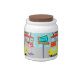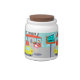 Serve up something special with this 1950's Diner Candy Jar. The cartoon drawing design features a red brick building with blue windows, gray double doors, and a white sign that says, "Diner" perched on the roof. In the parking lot, a second sign is on a pole. The sign has a turquoise background and a flashing red arrow pointing the way to, "Don's Diner." The sign has done its job because there is a bright yellow car with fins parked next to it. Even though we can't see them, the passengers of the car must be smacking their lips. A cute, young carhop is rollerskating her way to the car. Her brunette hair is in a bouncy ponytail. She is wearing a short, pink uniform with black trim and a white apron. Balanced on one hand, the carhop is carrying a black tray holding a giant hamburger and a refreshing, old-fashioned, glass bottle of soda. The background behind the diner is teal with light blue clouds and the silhouettes of cedar trees.