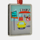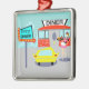Serve up something special with this 1950's Diner Christmas Ornament. The cartoon drawing design features a red brick building with blue windows, gray double doors, and a white sign that says, "Diner" perched on the roof. In the parking lot, a second sign is on a pole. The sign has a turquoise background and a flashing red arrow pointing the way to, "Don's Diner." The sign has done its job because there is a bright yellow car with fins parked next to it. Even though we can't see them, the passengers of the car must be smacking their lips. A cute, young carhop is rollerskating her way to the car. Her brunette hair is in a bouncy ponytail. She is wearing a short, pink uniform with black trim and a white apron. Balanced on one hand, the carhop is carrying a black tray holding a giant hamburger and a refreshing, old-fashioned, glass bottle of soda. The background behind the diner is teal with light blue clouds and the silhouettes of cedar trees.