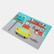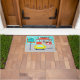 Serve up something special with this 1950's Diner Door Mat. The cartoon drawing design features a red brick building with blue windows, gray double doors, and a white sign that says, "Diner" perched on the roof. In the parking lot, a second sign is on a pole. The sign has a turquoise background and a flashing red arrow pointing the way to, "Don's Diner." The sign has done its job because there is a bright yellow car with fins parked next to it. Even though we can't see them, the passengers of the car must be smacking their lips. A cute, young carhop is rollerskating her way to the car. Her brunette hair is in a bouncy ponytail. She is wearing a short, pink uniform with black trim and a white apron. Balanced on one hand, the carhop is carrying a black tray holding a giant hamburger and a refreshing, old-fashioned, glass bottle of soda. The background behind the diner is teal with light blue clouds and the silhouettes of cedar trees.