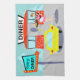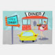 Serve up something special with this 1950's Diner Kitchen Towel. The cartoon drawing design features a red brick building with blue windows, gray double doors, and a white sign that says, "Diner" perched on the roof. In the parking lot, a second sign is on a pole. The sign has a turquoise background and a flashing red arrow pointing the way to, "Don's Diner." The sign has done its job because there is a bright yellow car with fins parked next to it. Even though we can't see them, the passengers of the car must be smacking their lips. A cute, young carhop is rollerskating her way to the car. Her brunette hair is in a bouncy ponytail. She is wearing a short, pink uniform with black trim and a white apron. Balanced on one hand, the carhop is carrying a black tray holding a giant hamburger and a refreshing, old-fashioned, glass bottle of soda. The background behind the diner is teal with light blue clouds and the silhouettes of cedar trees.