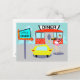 Serve up something special with this 1950's Diner Postcard. The cartoon drawing design features a red brick building with blue windows, gray double doors, and a white sign that says, "Diner" perched on the roof. In the parking lot, a second sign is on a pole. The sign has a turquoise background and a flashing red arrow pointing the way to, "Don's Diner." The sign has done its job because there is a bright yellow car with fins parked next to it. Even though we can't see them, the passengers of the car must be smacking their lips. A cute, young carhop is rollerskating her way to the car. Her brunette hair is in a bouncy ponytail. She is wearing a short, pink uniform with black trim and a white apron. Balanced on one hand, the carhop is carrying a black tray holding a giant hamburger and a refreshing, old-fashioned, glass bottle of soda. The background behind the diner is teal with light blue clouds and the silhouettes of cedar trees.