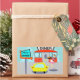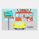 Serve up something special with this 1950's Diner Rectangle Stickers. The cartoon drawing design features a red brick building with blue windows, gray double doors, and a white sign that says, "Diner" perched on the roof. In the parking lot, a second sign is on a pole. The sign has a turquoise background and a flashing red arrow pointing the way to, "Don's Diner." The sign has done its job because there is a bright yellow car with fins parked next to it. Even though we can't see them, the passengers of the car must be smacking their lips. A cute, young carhop is rollerskating her way to the car. Her brunette hair is in a bouncy ponytail. She is wearing a short, pink uniform with black trim and a white apron. Balanced on one hand, the carhop is carrying a black tray holding a giant hamburger and a refreshing, old-fashioned, glass bottle of soda. The background behind the diner is teal with light blue clouds and the silhouettes of cedar trees.
