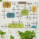 A classic mid century modern style pattern with lines and rounded squares and rectangles.