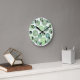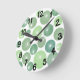 This wall clock has a mid-century modern design of circles in shades of 1950s green with white starbursts in them, all on a field of white.